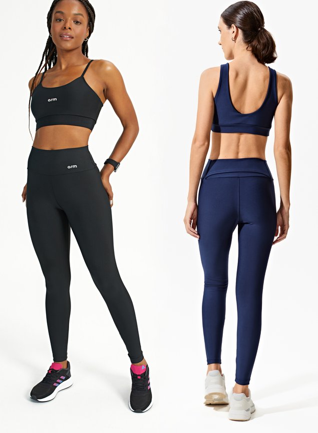 Ambos os conjuntos possuem cores neutras e logo minimalista aplicados com sutileza, permitindo combinações versáteis tanto para o treino quanto para o lifestyle.